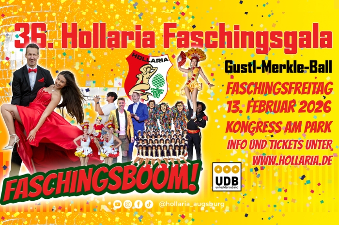 Augsburgs größte Faschingsparty! Die 36. Hollaria Faschingsgala "¡Vamos a España!" Traditionell findet am Faschingsfreitag der Gustl-Merkle-Ball statt. Für Faschingslaune sorgen u.a. die Auftritte der Tänzerinnen u. Tänzer der Hollaria-Mannschaften, die Garde-Auftritte der Buchnesia (Nürnberg) u. die Allersberger Flecklashexen. Mit dabei die United Dance Band, sowie ein DJ, Trompeter Lagix u. Partysänger Bene die im Hauptsaal u. auch im kleinen Kongressaal mit toller Musik für Stimmung sorgen. Im Foyer gibt es wieder eine Headphone-Party. Alle Termine & Infos